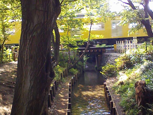 玉川上水の上を走る、黄色とシルバーの西武線電車(鷹の台駅近くにて)